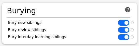 We strongly encourage you activate burying to make your learning most efficient. Otherwise you may for example be asked to do Reading for a word that you just completed Pronunciation for, which makes it too easy. This would hurt your long term progress since a few weeks later you no longer have the Pronunciation context and will fail. Also in real-life situations when you need to read a word you lack that context.